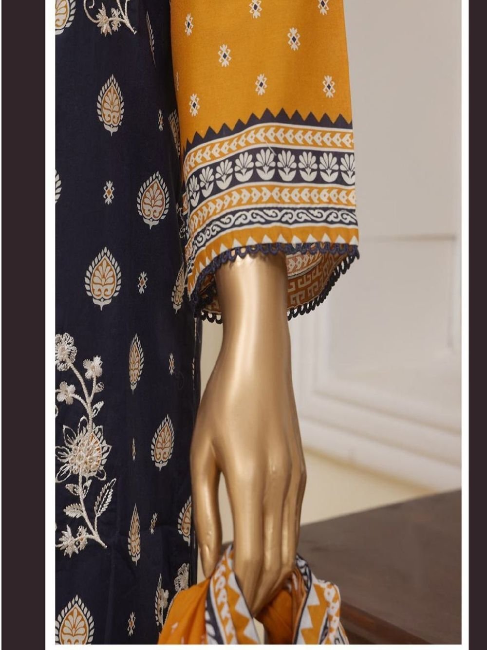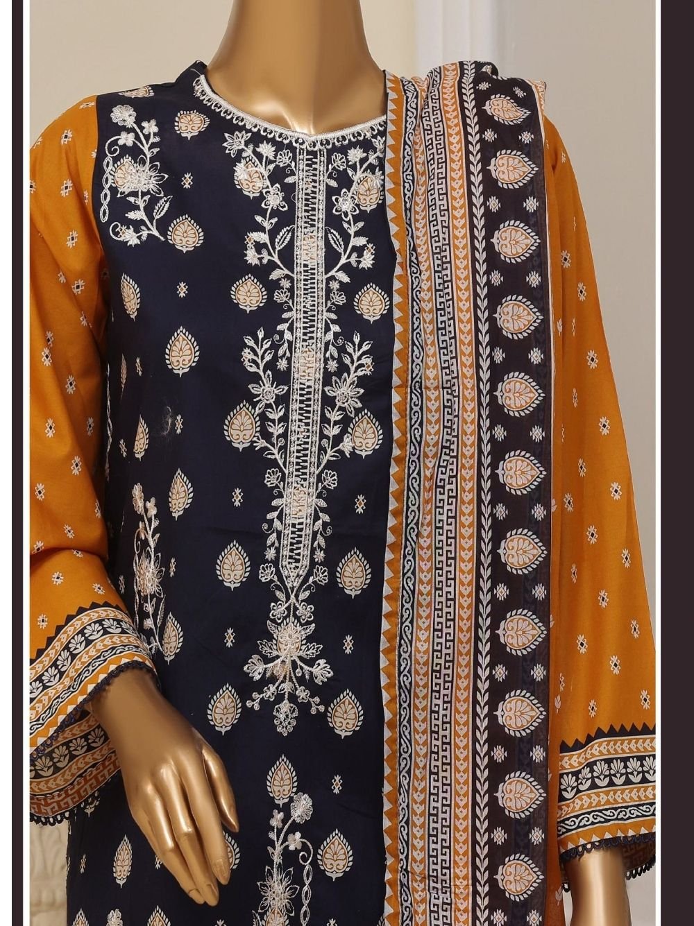 Stunning in every way! This black & honey orange embroidered lawn stitched suit comes with a chic lawn dupatta and plain trousers, perfect for a bold and stylish look! 🖤