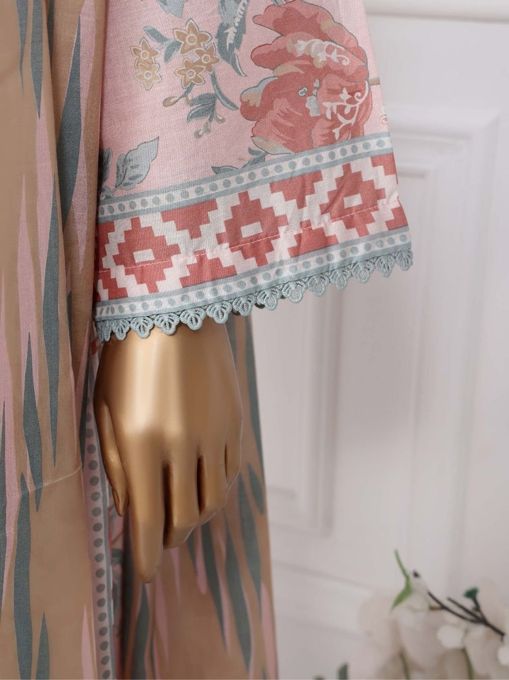 Stylish 3-piece stitched lawn suit in Dust Storm color, featuring a printed lawn shirt, matching printed dupatta, and a plain trouser for a trendy look!