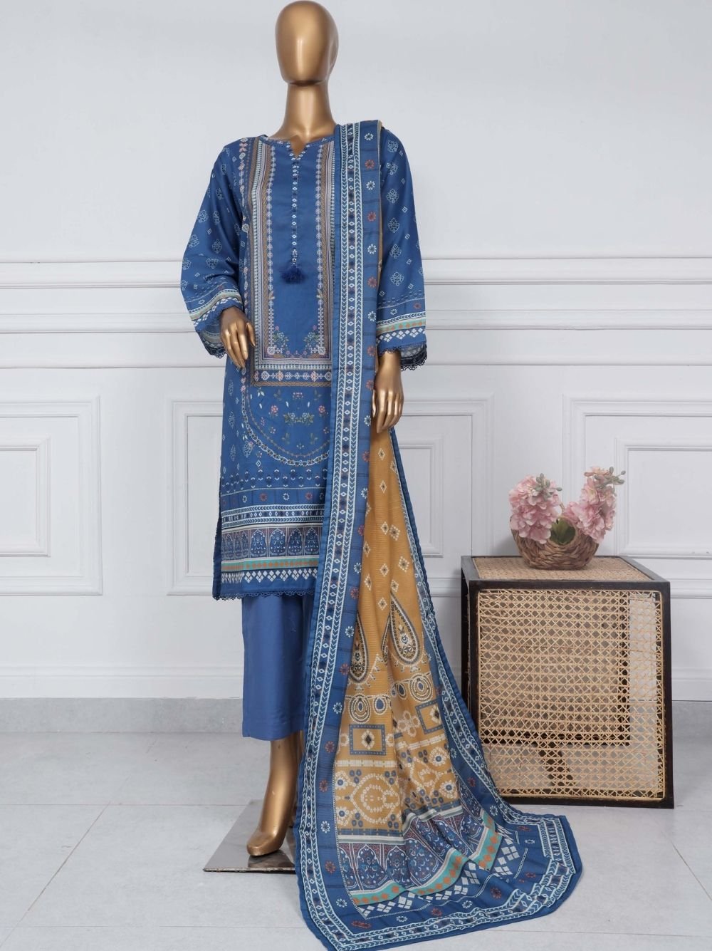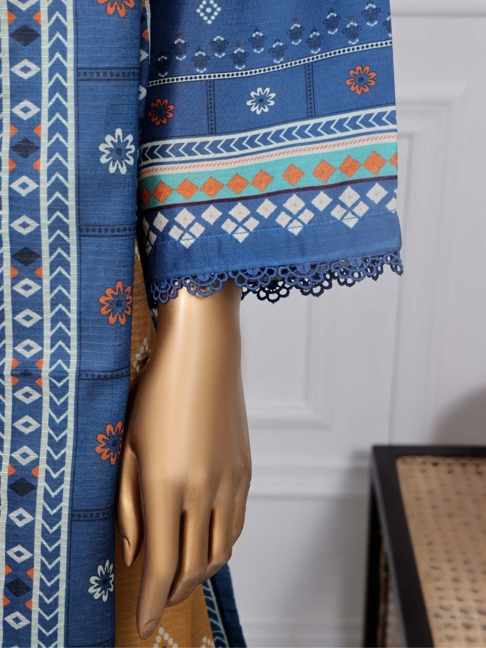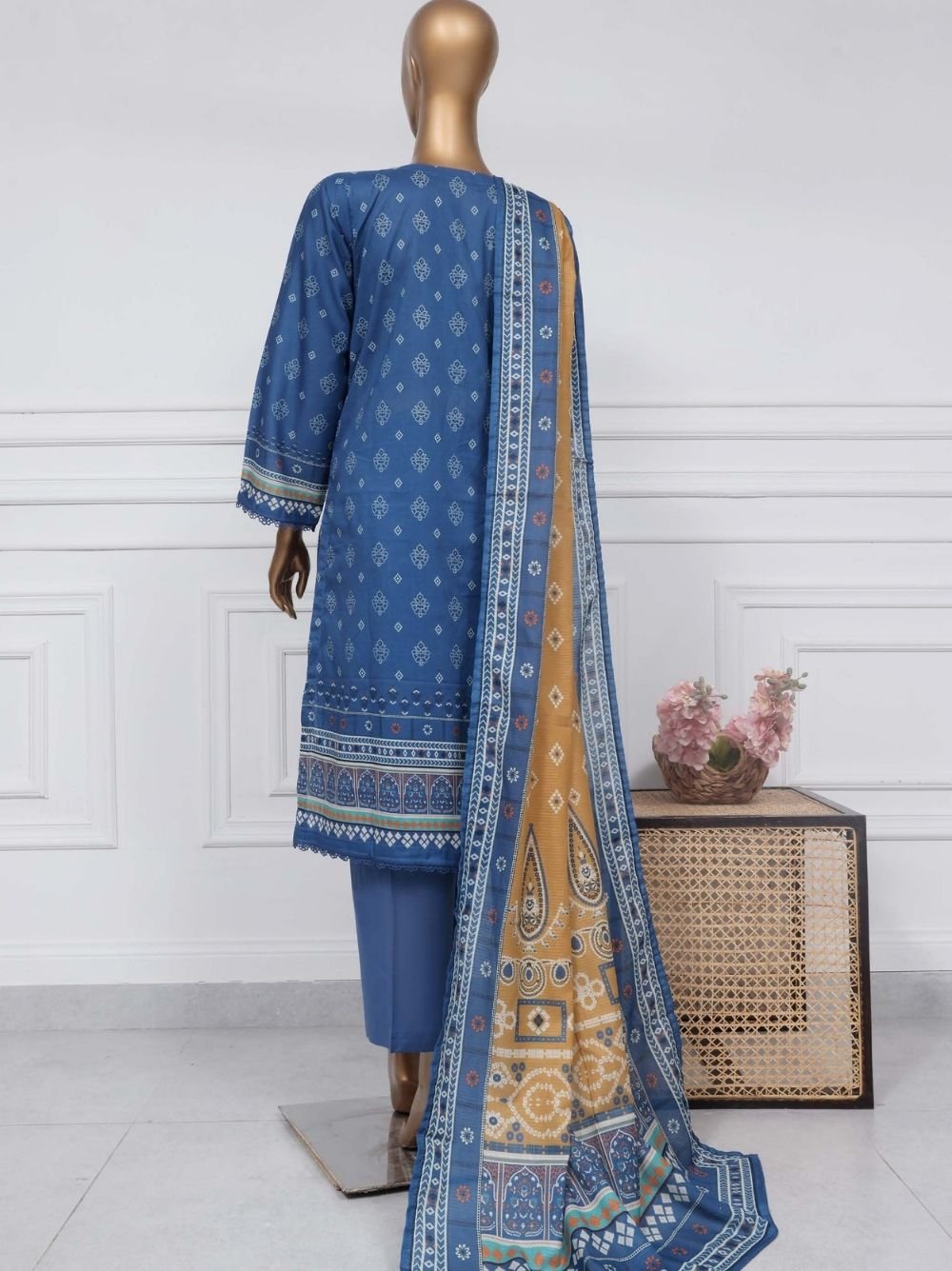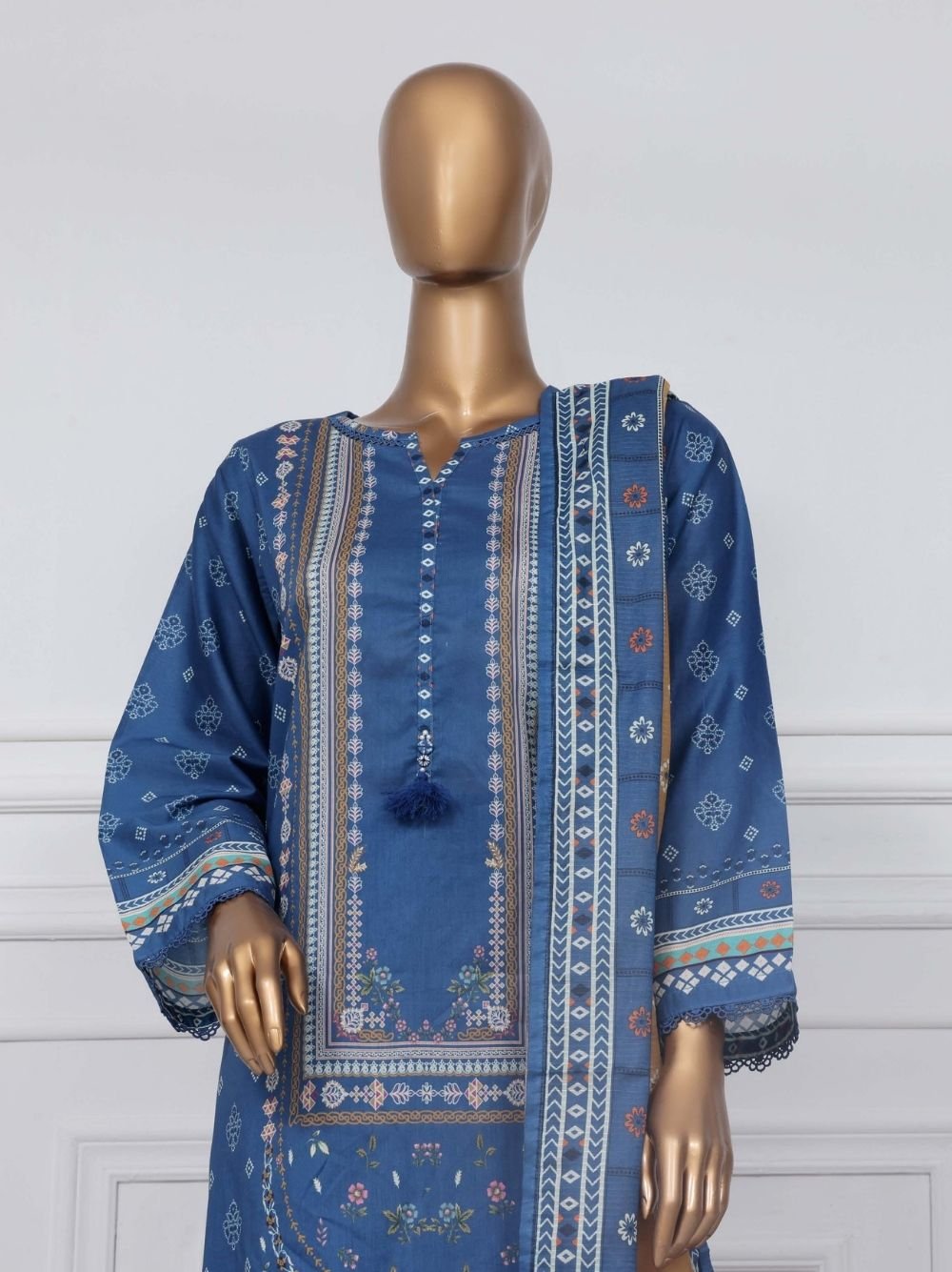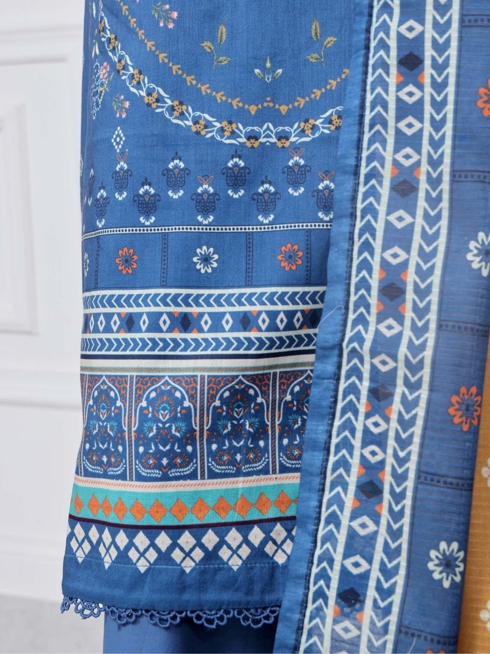 Stylish 3-piece stitched lawn suit in Metallic Blue, featuring a printed lawn shirt, matching printed dupatta, and a plain trouser for a trendy look!