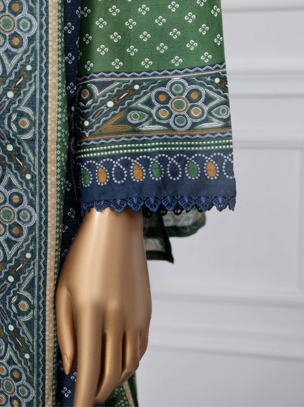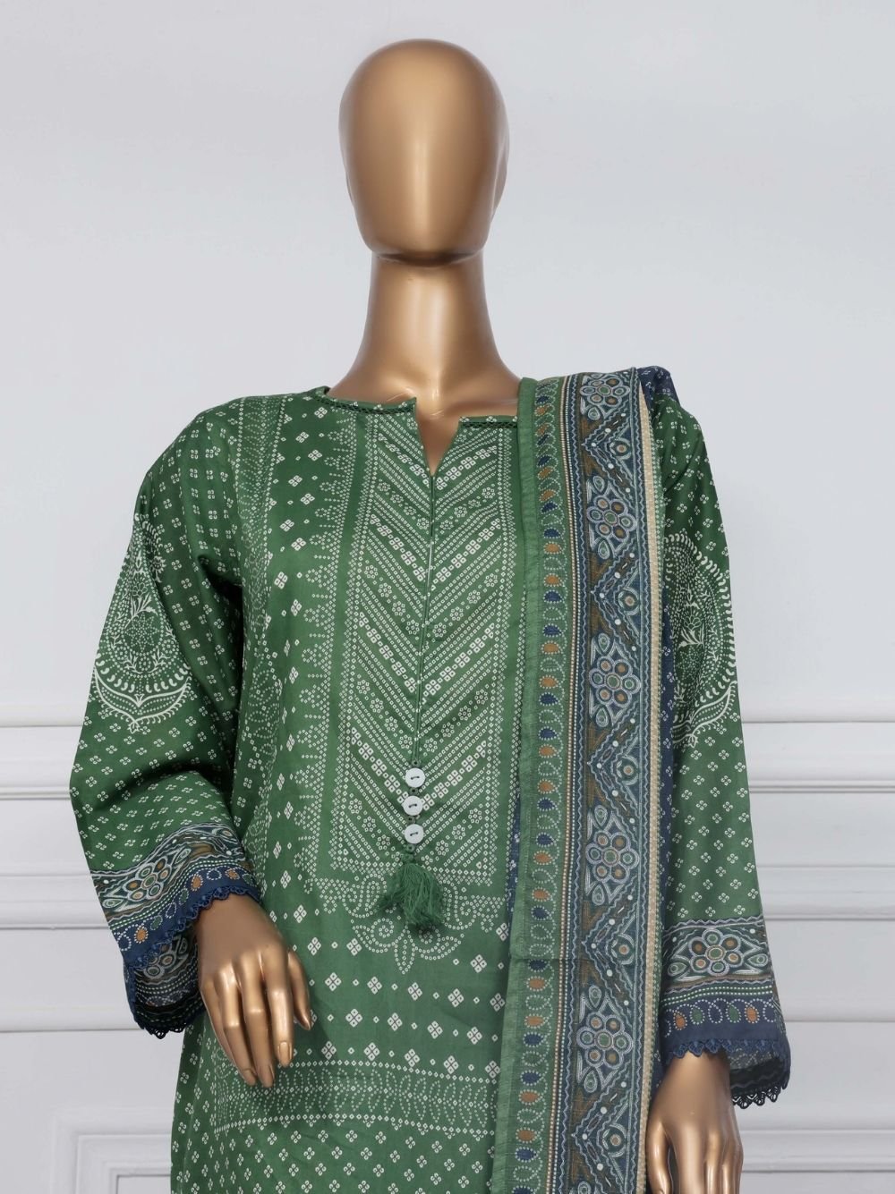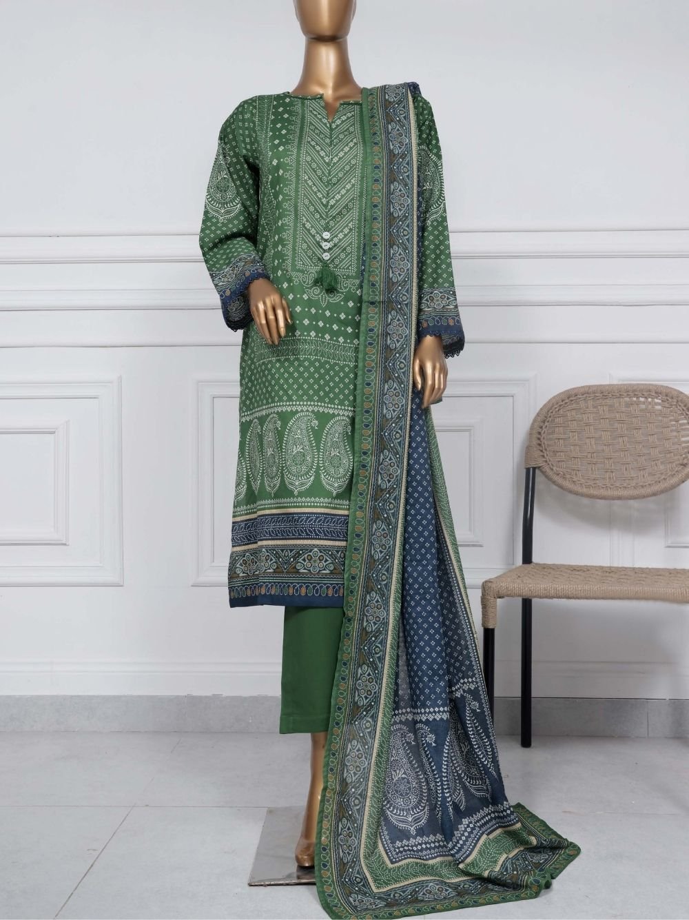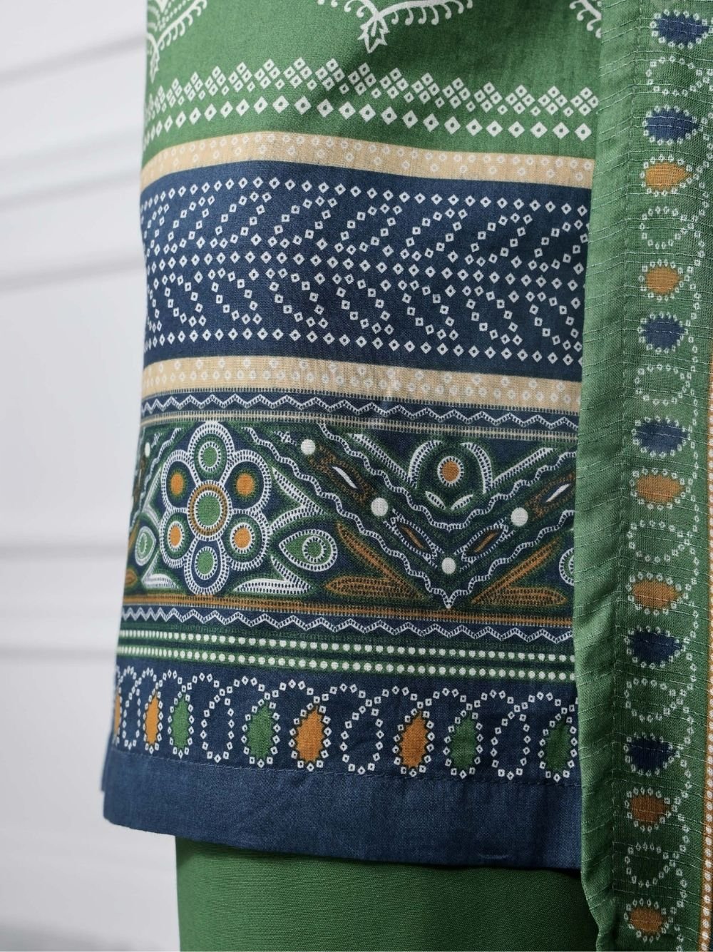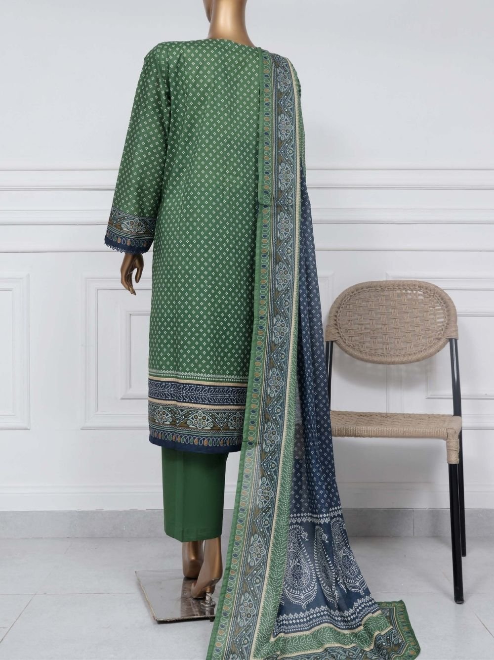 Trendy 3-piece stitched lawn suit in Fern Green, featuring a printed lawn shirt, matching printed dupatta, and a plain trouser for a chic and fresh look!